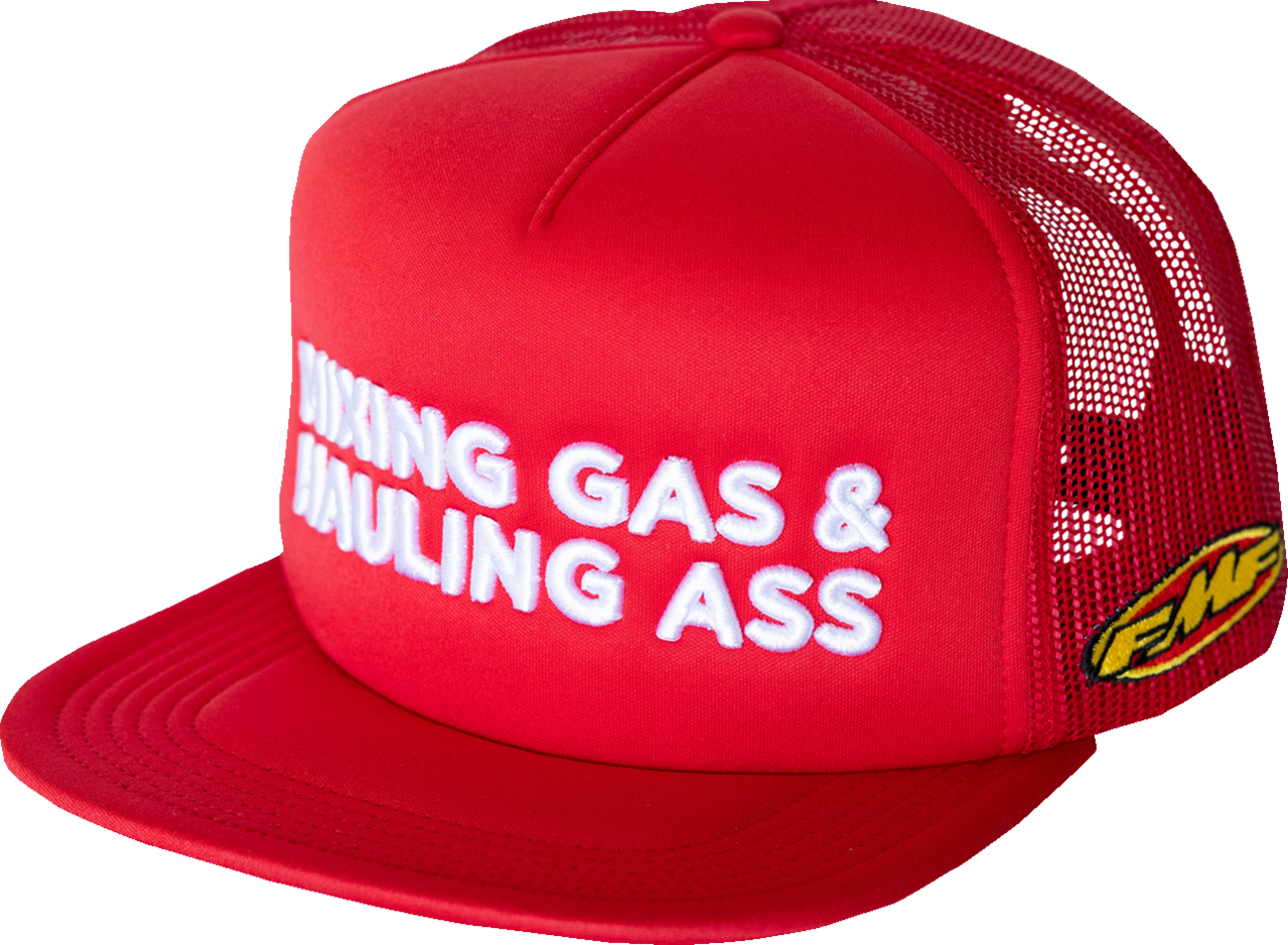 - Raised embroidered Mixing Gas & Hauling Ass on front, FMF logo embroidery at side and FMF woven label at rear of the hat