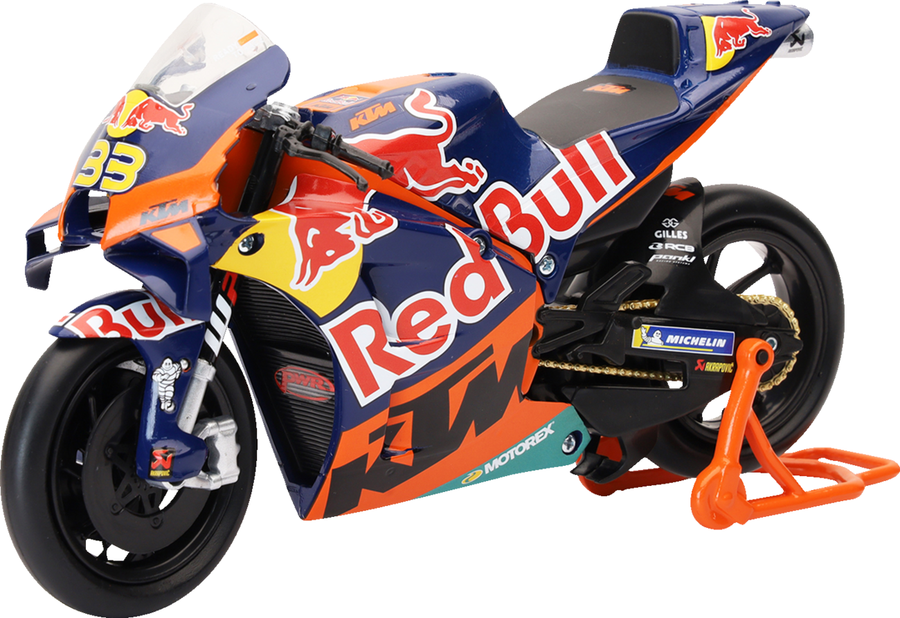 - Mini MotoGP bike features iconic Red Bull and KTM logos